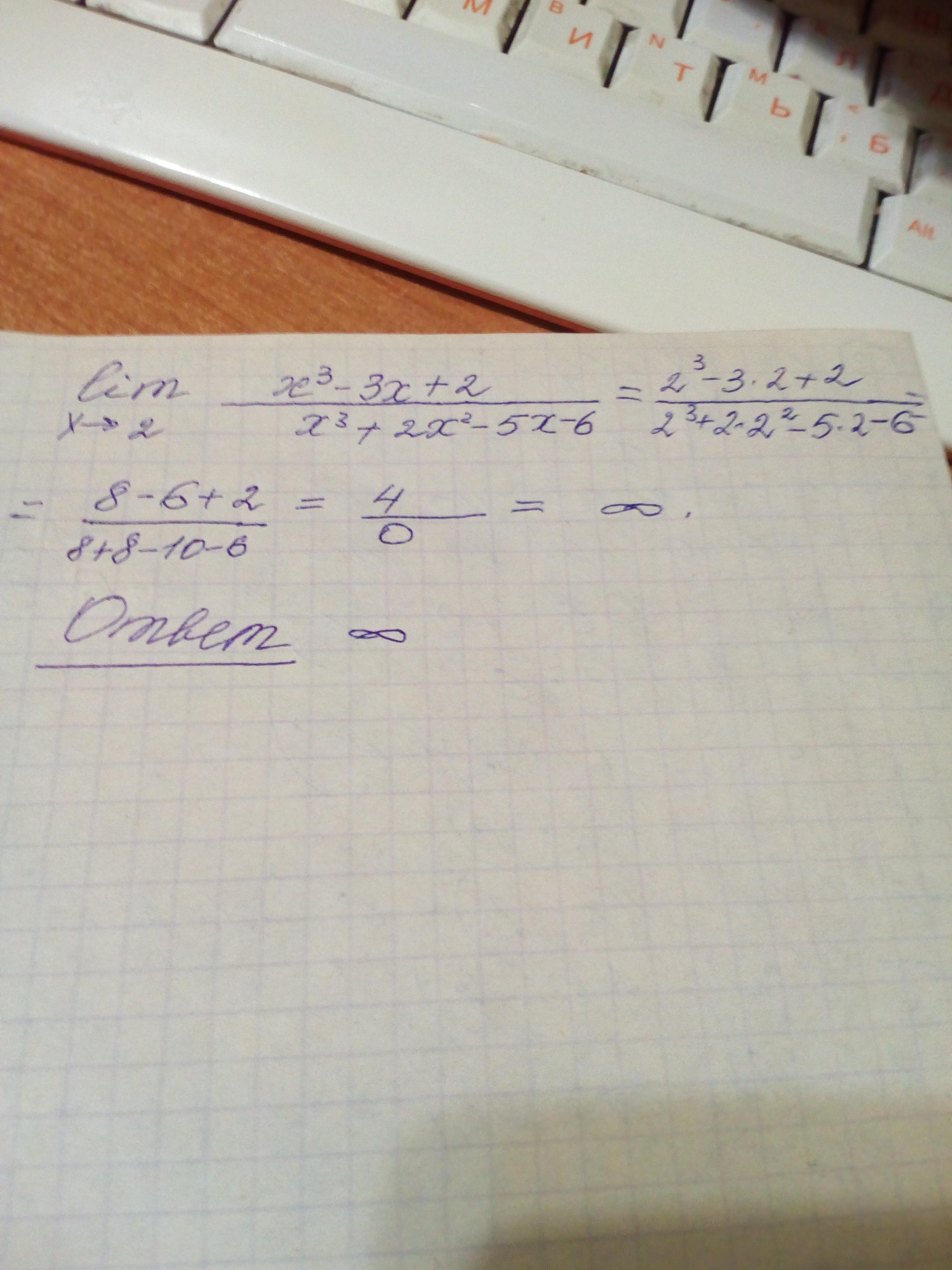 подставляешь 2 вместо х.в числителе получить 4,в знаменателе 0.ответ: + бесконечность.