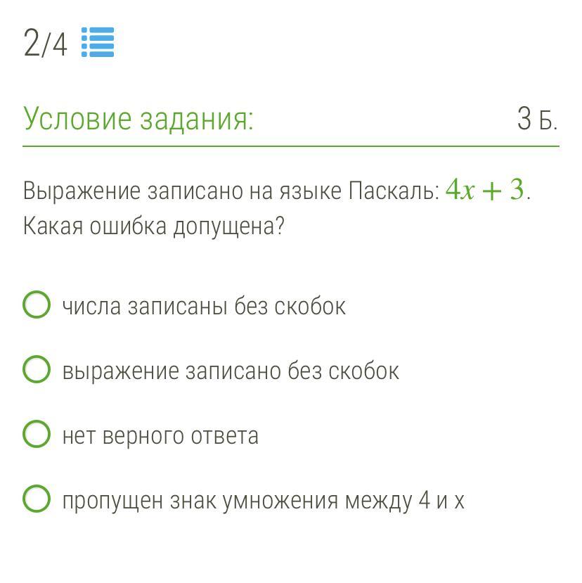 Правильны ответ: Пропущен знак умножения между 4 и х.