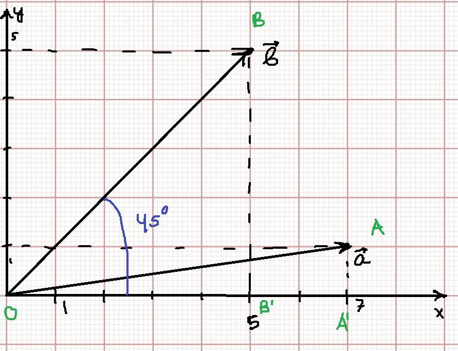 Я построил эти векторы. Не нужно быть учёным, чтобы понять, что угол между вектором b и осью x равен 45 градусам. Хотя бы потому, что катеты прямоугольного треугольника OBB' равны.