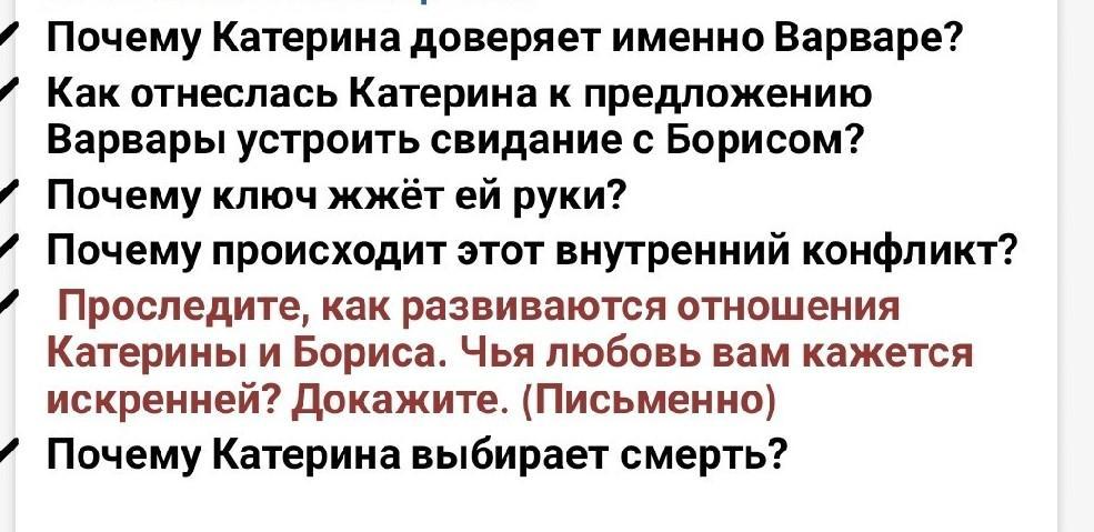 2)Ну Катерина была сначала против так как она не могла изменить своему мужчине хотя и не любила его, ведь она была хорошо воспитана, но в конце концов Варвара смогла её отговорить и Катерина пошла на свидание в Борисом