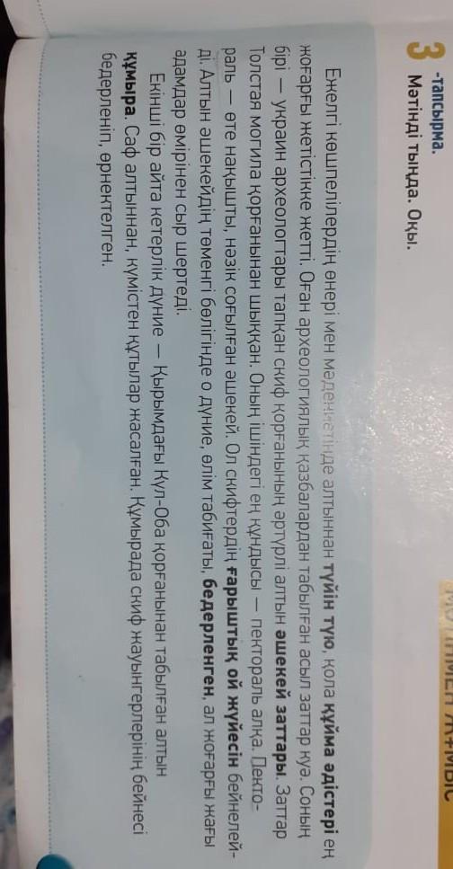 O) - задание. Слушай текст. Читайте. Lo 8 в искусстве и культуре древних кочевников самые высокие достижения добились методов золотодобычи, бронзового литья. Ему свидетельствуют драгоценные вещи, обнаруженные в археологических раскопках. Один из них - различные золотые украшения скифского кургана, найденные украинскими археологами. Предметы из Кургана Толстая могила. Самый ценный из них-пектораль ожерелье. Пекто-раль-это очень очаровательное, нежное кованое украшение. Он изображает космическую систему мыслей скифов. В нижней части золотого украшения о мире, природа смерти, рельефная, а верхняя часть-о жизни людей. Во-вторых, это золотой кувшин, найденный в Крыму из Кургана Кул-Оба. Саф изготовлен из золота, серебра. В мураве изображены и орнаментированы изображения воинов скифов. (c ******************************