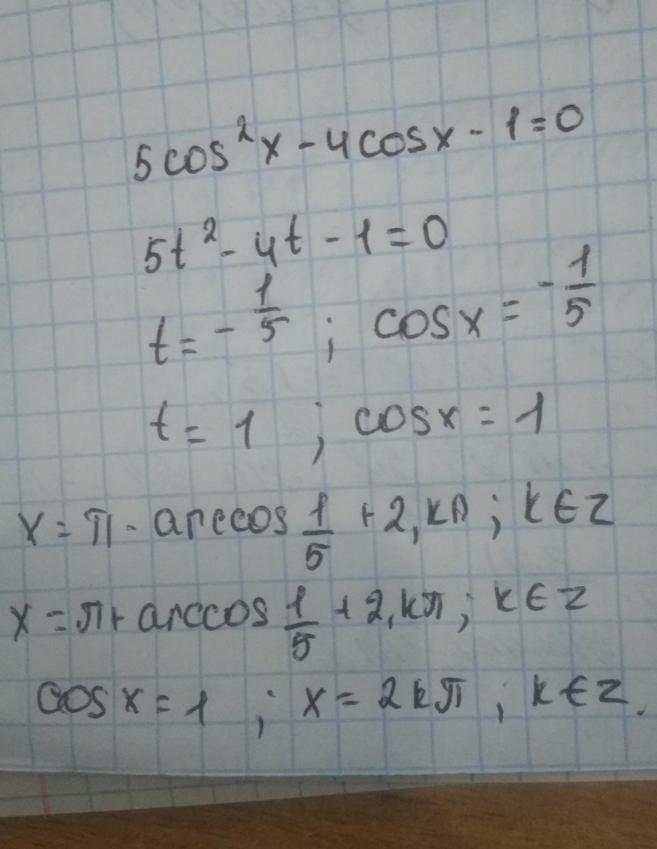 Пусть cos(x)=t, тогда данное уравнение примет вид: 5*t²-4*t-1=0. Это уравнение имеет решения t1=cos(x1)=1 и t2=cos(x2)=-1/5. Отсюда x1=2*π*k, где k∈Z и x2=+-arccos(-1/5)+2*π*n, где n∈Z.