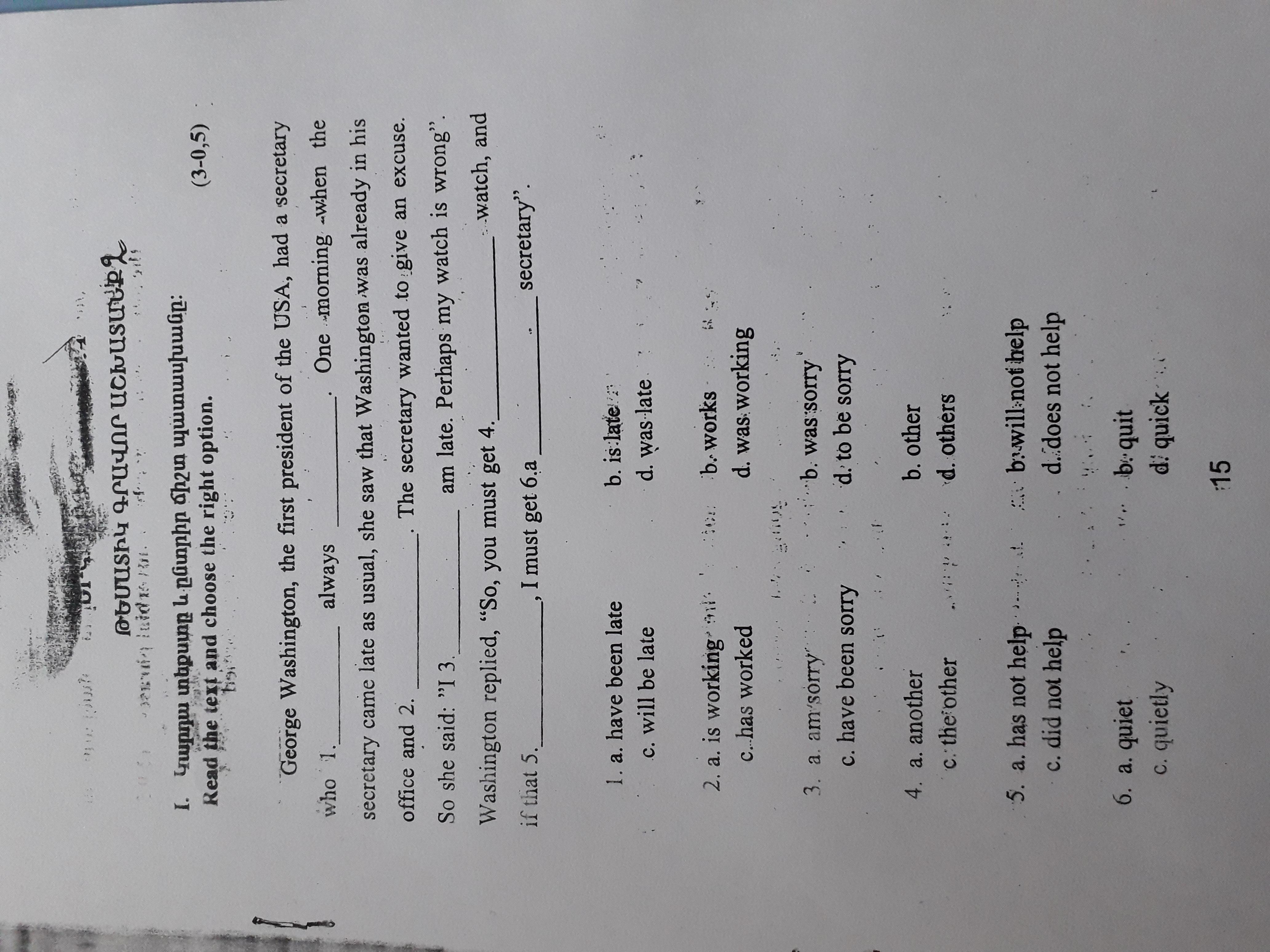 George Washington, the first president of the USA, had a secretary who 1. d. was always late. One morning when the secretary came late as usual, she saw that Washington was already in his office and 2 d. was working. The secretary wanted to give an excuse. So she said: "I 3. a. am sorry am late. Perhaps my watch is wrong". Washington replied, "So, you must get 4. a. another watch, and if that 5. d. does not help I must get 6. a d. quick secretary".