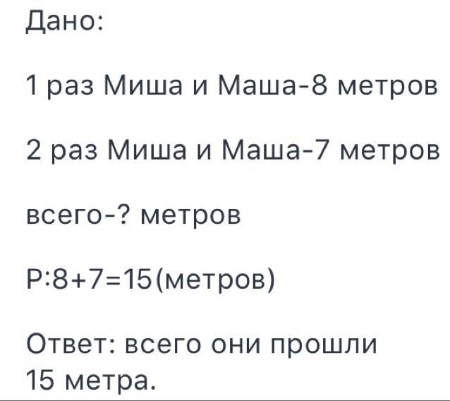 Миша делает 7шагов , Маша 5 шагов, вместе делают 8 метров, Миша делает 5 шагов, Маша 7 шагов вместе 7 метров, надо задать вопрос и решить задачу