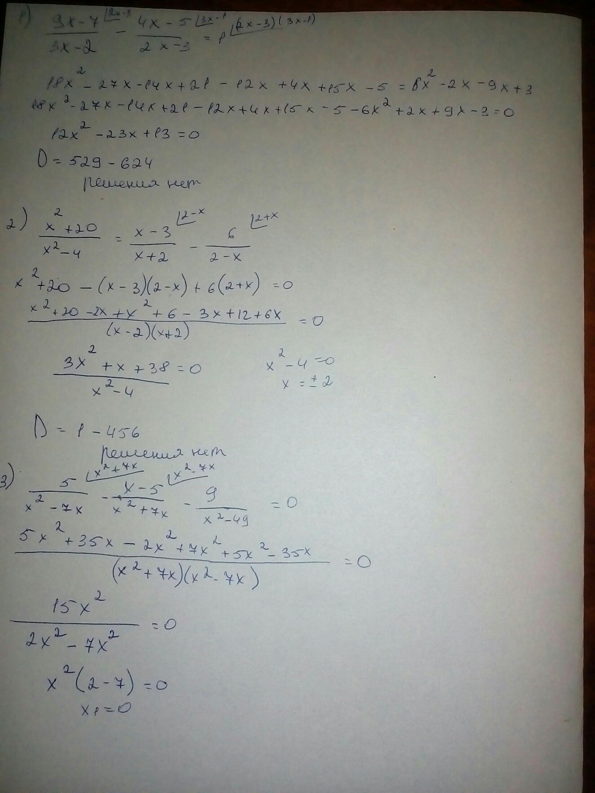 1)9x-7/3x-2-4x-5/2x-3=1. 2)x^2+20/x^2-4=x-3/x+2-6/2-x.