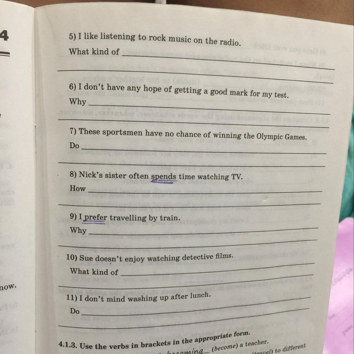 1) What kind of music are you listening on the radio? 2)Why don’t you have any hope of getting a good mark for your test? 3)Fo these sportsmen have any chance of winning the Olympic Games? 4)How Nicks sister spends her time? 5)Why do you prefer traveling by train? 6)What kind of films doesn’t enjoy Sue? 7)Do you mind washing up after lunch? ( I think I wrote everything right,but if there’s any mistakes I’m sorry)