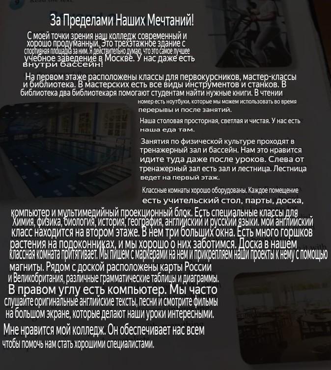 Вне наших снов! С моей точки зрения, наш колледж современный и продуманный. Это трехэтажное здание со спортивной площадкой позади. Я действительно считаю, что это лучшее учебное заведение в Москве. У нас даже есть внутренний бассейн! На первом этаже расположены классные комнаты для первокурсников, мастерские и библиотека. В мастерских есть все виды инструментов и машин. В библиотеке библиотекари помогают студентам найти нужные им книги. В читальном зале есть ноутбуки, которые мы можем использовать во время перерывов и после занятий. Наша столовая просторная, светлая и чистая. У нас там есть еда. Уроки физкультуры проходят в гимназии и бассейне. Нам нравится ходить туда даже после уроков. Слева от спортзала находится холл и лестница. Лестница ведет на второй этаж. Классные комнаты хорошо оборудованы. В каждой комнате есть учительский стол, парты, доска, компьютер и мультимедийный проекционный блок. Есть специальные классы для химии, физики, биологии, истории, географии, английского и русского языков. Моя английская классная комната находится на втором этаже. У него три больших окна. На подоконниках много горшечных растений, и мы хорошо о них заботимся. Доска в нашем классе магнитная. Мы пишем на нем маркерами и прикрепляем к нему наши проекты с помощью магнитов. Рядом с доской находятся карты России и Великобритании, различные грамматические таблицы и диаграммы. В правом углу находится компьютер. Мы часто слушаем оригинальные английские тексты, песни и смотрим фильмы на большом экране, что делает наши уроки интересными. Мне нравится мой колледж. Это дает нам все, чтобы помочь нам стать хорошими специалистами.