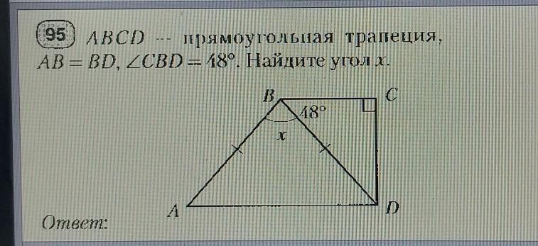 Рассмотрим прямоугольный треугольник BCD. В нем угол CDB равен: 90-48=42 градуса