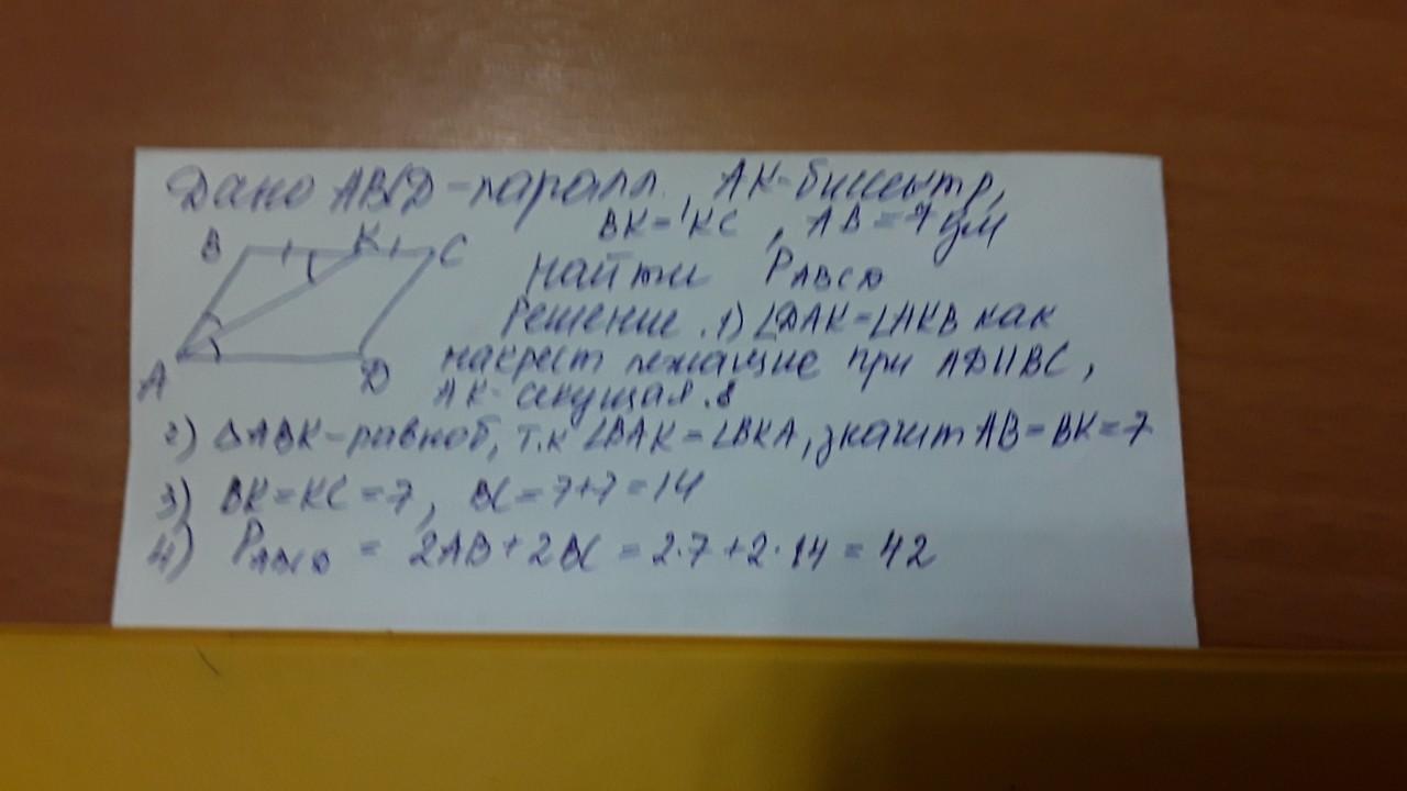 Биссектриса острого угла параллелограмма делит его большую сторону пополам.Найти периметр параллелограмма, если меньшая сторона =7 дм