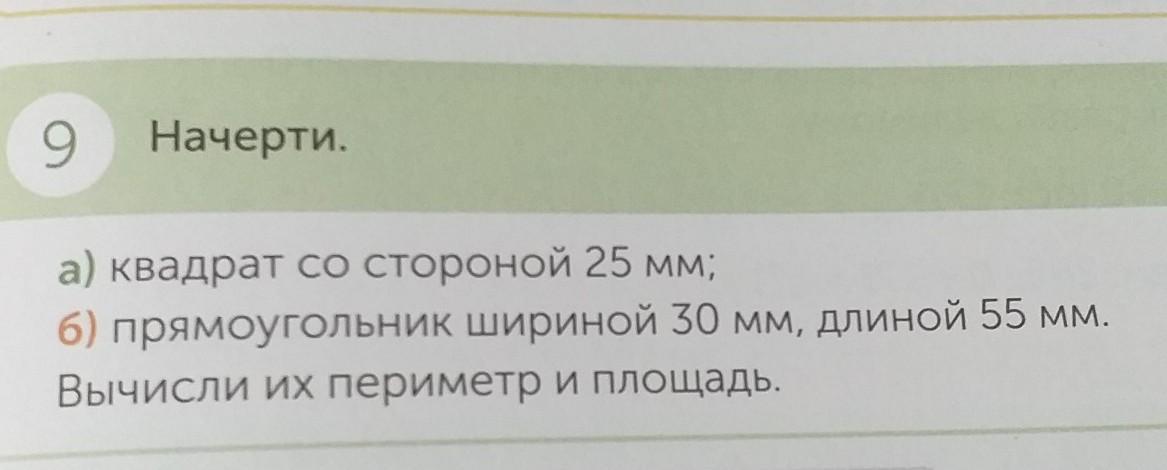 Пошаговое объяснение: S квадрата = 25•25=625мм Pквадрата =25+25+25+25=100мм S прямоугольника =30•55=1650мм P прямоугольника = 30+55+30+55 = 170мм