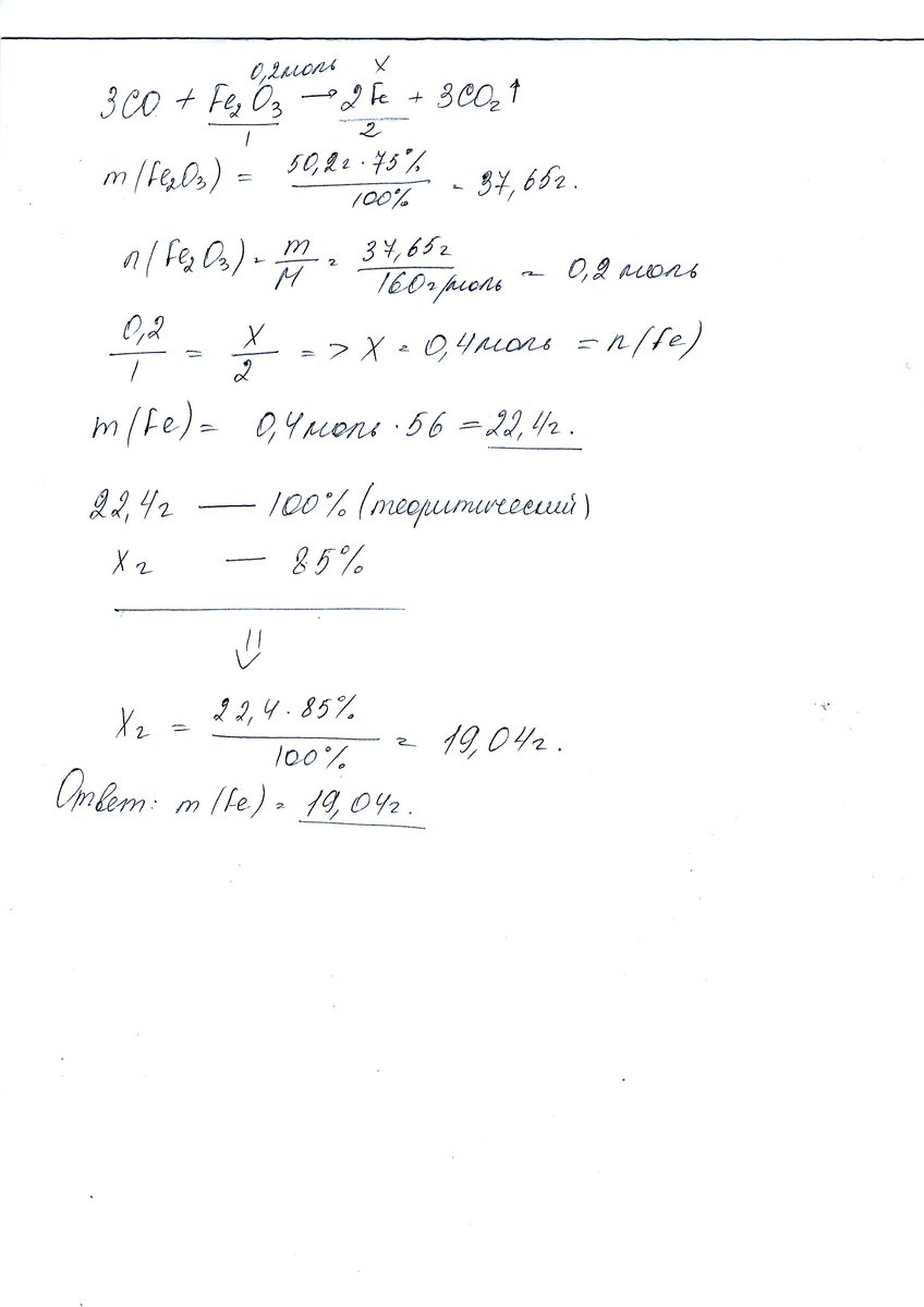 2. Сколько граммов железа можно получить с помощью угарного газа из 50,2 граммов красного железняка, содержащего 75% оксида железа (III), если практический выход железа составляет 85% от теоретического?C подробным объяснением