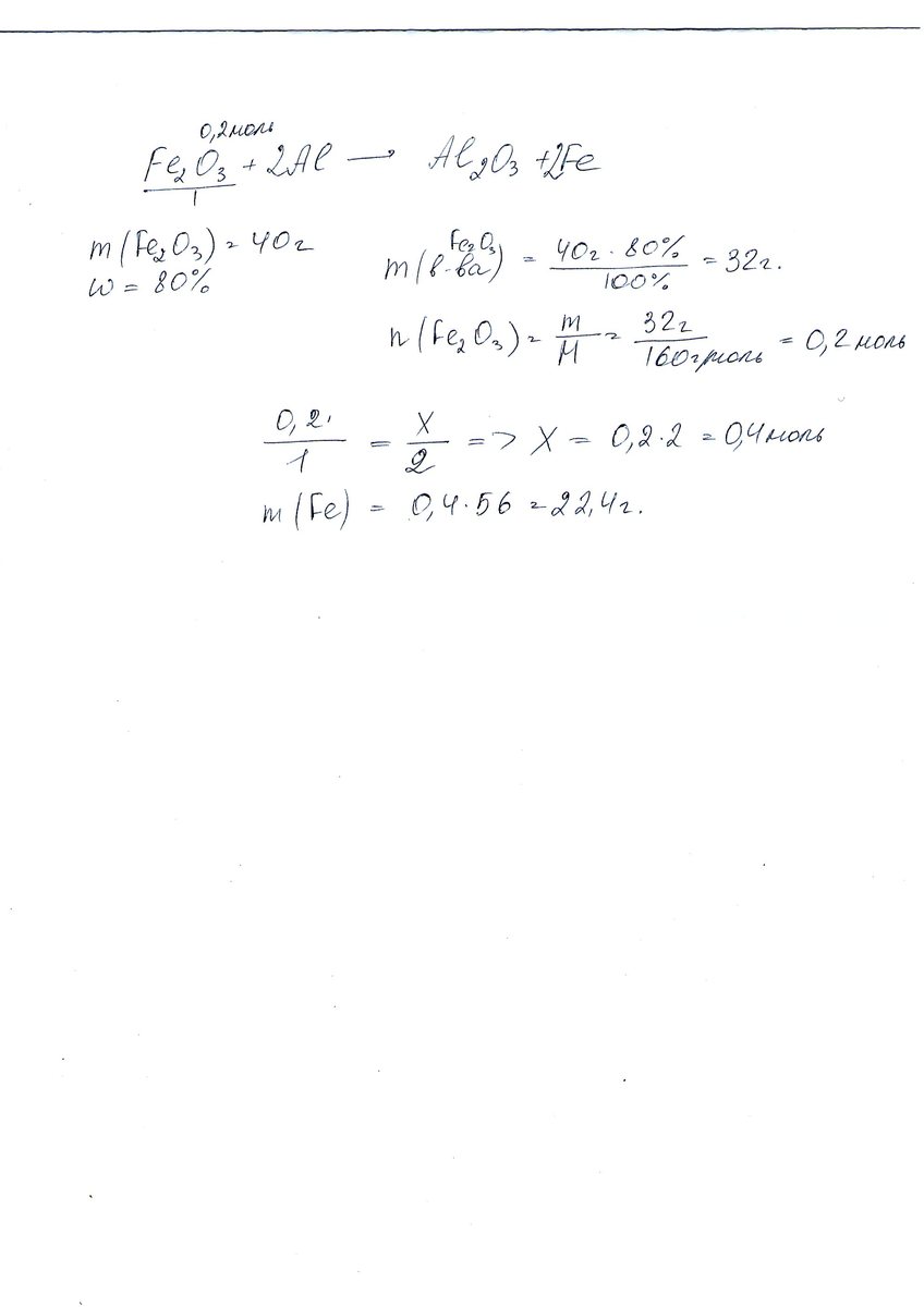 1.Сколько граммов железа можно получить алюминотермическим способом из 40 граммов красного железняка, содержащего 80% оксида железа (III)?