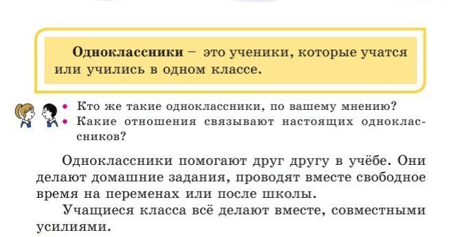 Ответ:одноклассники помигают в учёбе друг-другу и на переменах проводят время вместе.