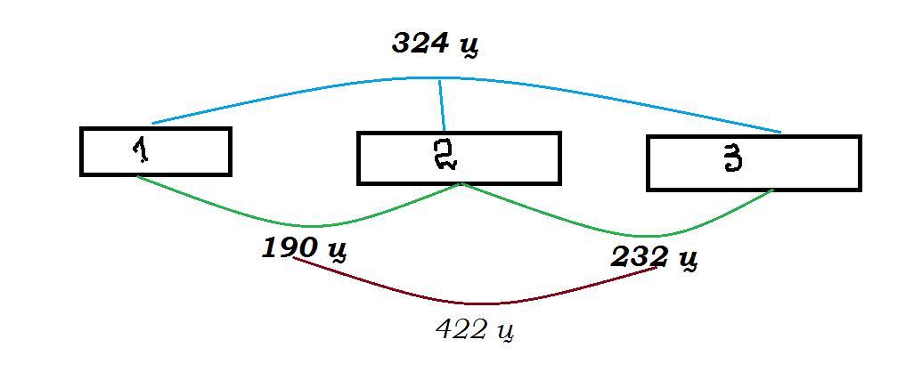 190 + 232 = 422 (ц) --- перевезено на 1-ой вместе со 2-ой и 2-ой вместе с 3-ей ( вторая считается 2 раза!)
