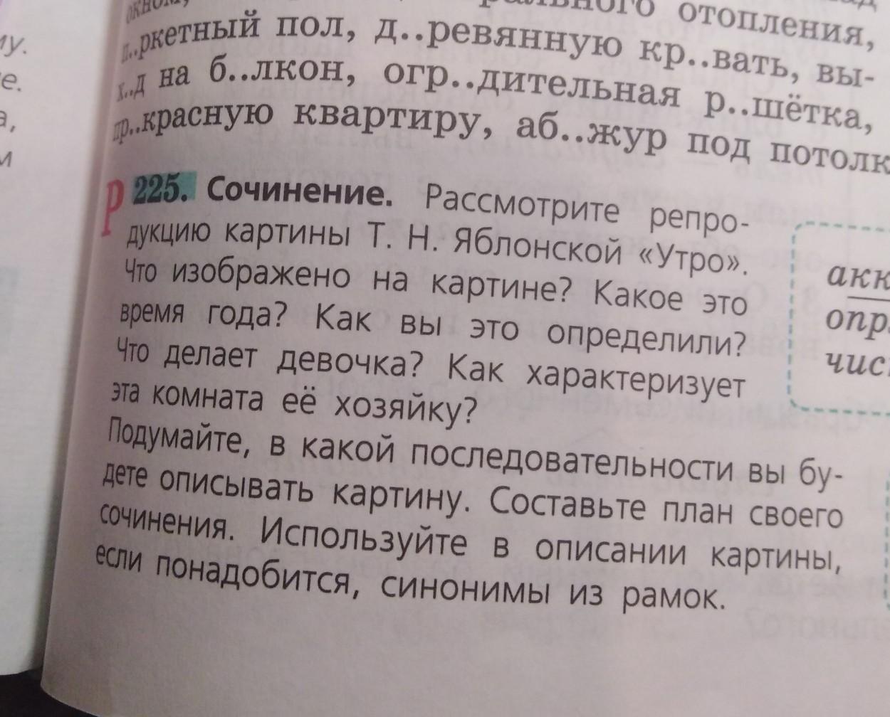 Татьяна Ниловна Яблонская писала реалистичные и жизненнные картины. Я бы хотела описать картину "Утро" написаннную в 1954 году в Киеве, которая так же картина представлена в коллекции Государственнной Третьяковской галереи. Картина выполнена в тёплых светлых тонах : бледно - жёлтые стены, которые придают комнате светлый образ. Она наполнена уютом и теплом, одна из стен, изображённных на картине, украшена комнатными растениями. Через распахнутые двери на балкон в комнату проникают утренние солнечные лучи, кроме того на балконе можно увидеть изобилие комнатных цветов. В центре картиры изображена юная пионерка. Девочка только встав с кровати, делает утреннию гимнастику, а дальше напиши про стол, на котором стоит уже приготовленнный мамой завтрак. И что тебе очень понравилась данная картина