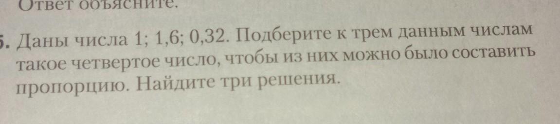 даны числа 1;1,6;0,32.Подберите к трем данным числам такое четвертое число,чтобы из них можно было составить пропорцию. Найдите 3 решения