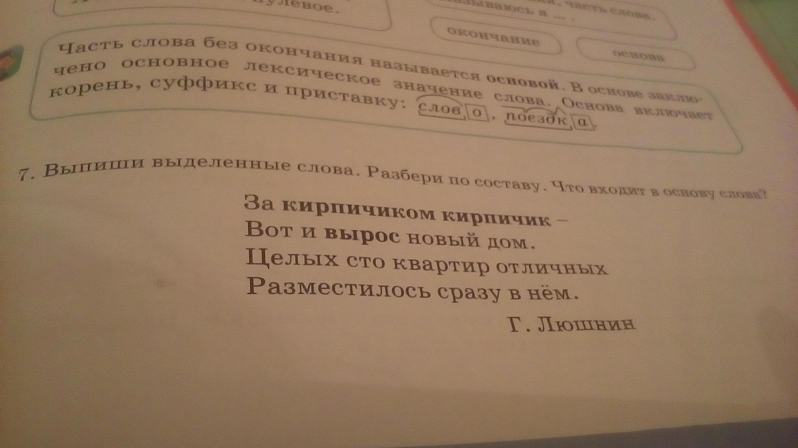 Выпиши выделенные слова. Разбери по составу. Что входит в основу слова? За кирпичиком кирпичик- вот и вырос новый дом целых сто квартир отличных разместилось сразу в нем