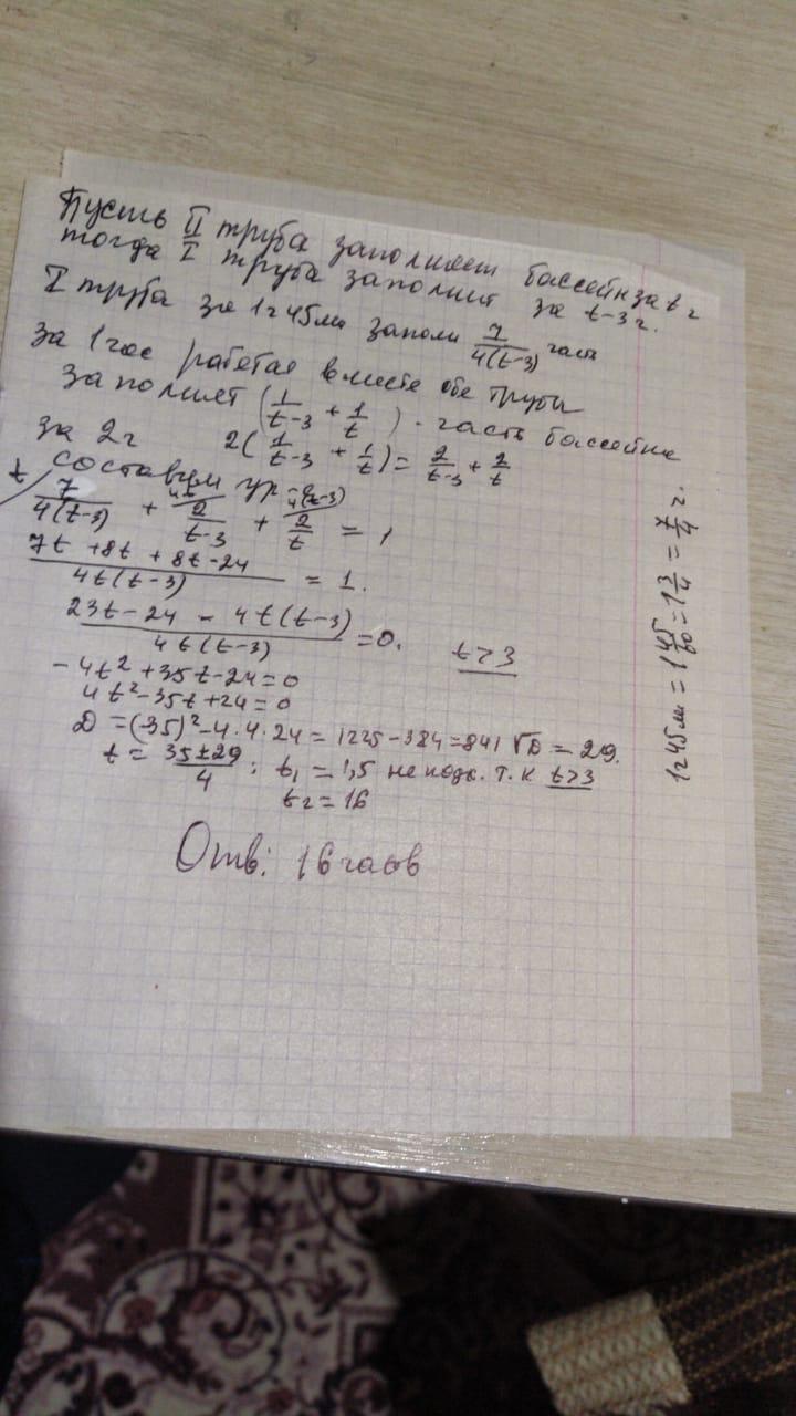 В бассейн проведены две трубы. Время, за которое наполняет бассейн только первая труба, на 3 часа меньше времени, за которое наполняет бассейн вторая труба, работая отдельно. Сначала, в течение 1 часа 45 минут только первая труба наполняла пустой бассейн, а затем открыли вторую трубу. Обе трубы работали еще два часа и наполнили бассейн. За какое время (в часах) наполнится бассейн, если включить только вторую трубу?