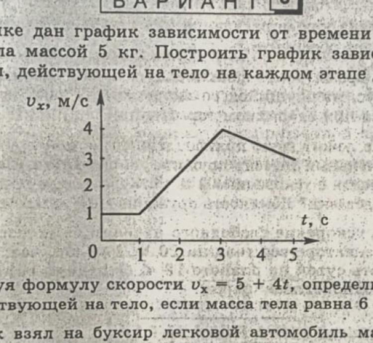На рисунке дан график зависимости от времени проекции скорости тела массой 5кг. Построить график зависимости проекции силы, действующей на тело на каждом этапе движения
