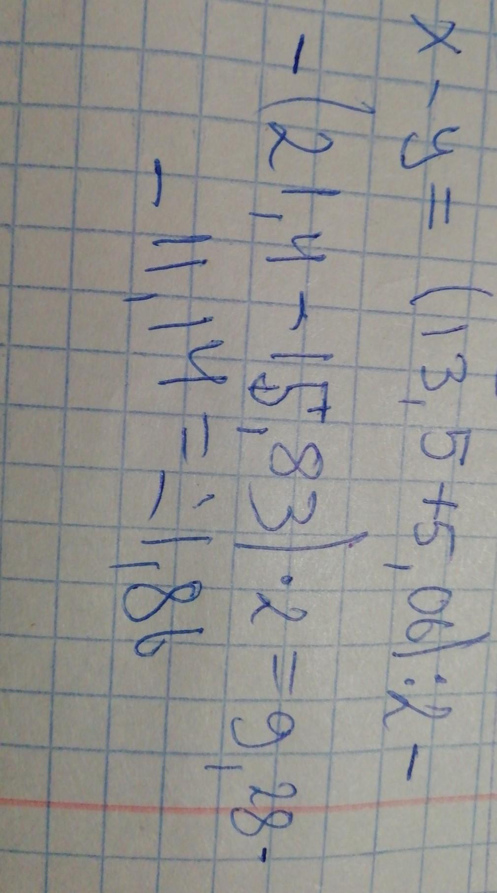найдите значения выражения x-y если x - полусумма чисел 13,5 и 5,06, а у - удвоенная разнсть чисел 21,4 и 15,83