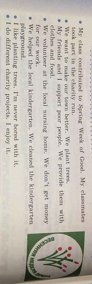 Мой класс внес свой вклад в Весеннюю неделю добра. Мои одноклассники приняли участие в благотворительном забеге. Мы хотим сделать наш город лучше. Мы сажаем деревья. Мы с друзьями поддерживаем бедных. Мы обеспечиваем их одеждой и едой. Мы волонтером в местном доме престарелых. Мы не получаем деньги за нашу работу. Мы помогли местному детскому саду. Мы убрали детскую площадку. Я люблю сажать деревья. Мне никогда не скучно с этим. Я занимаюсь разными благотворительными проектами. Мне нравится это.