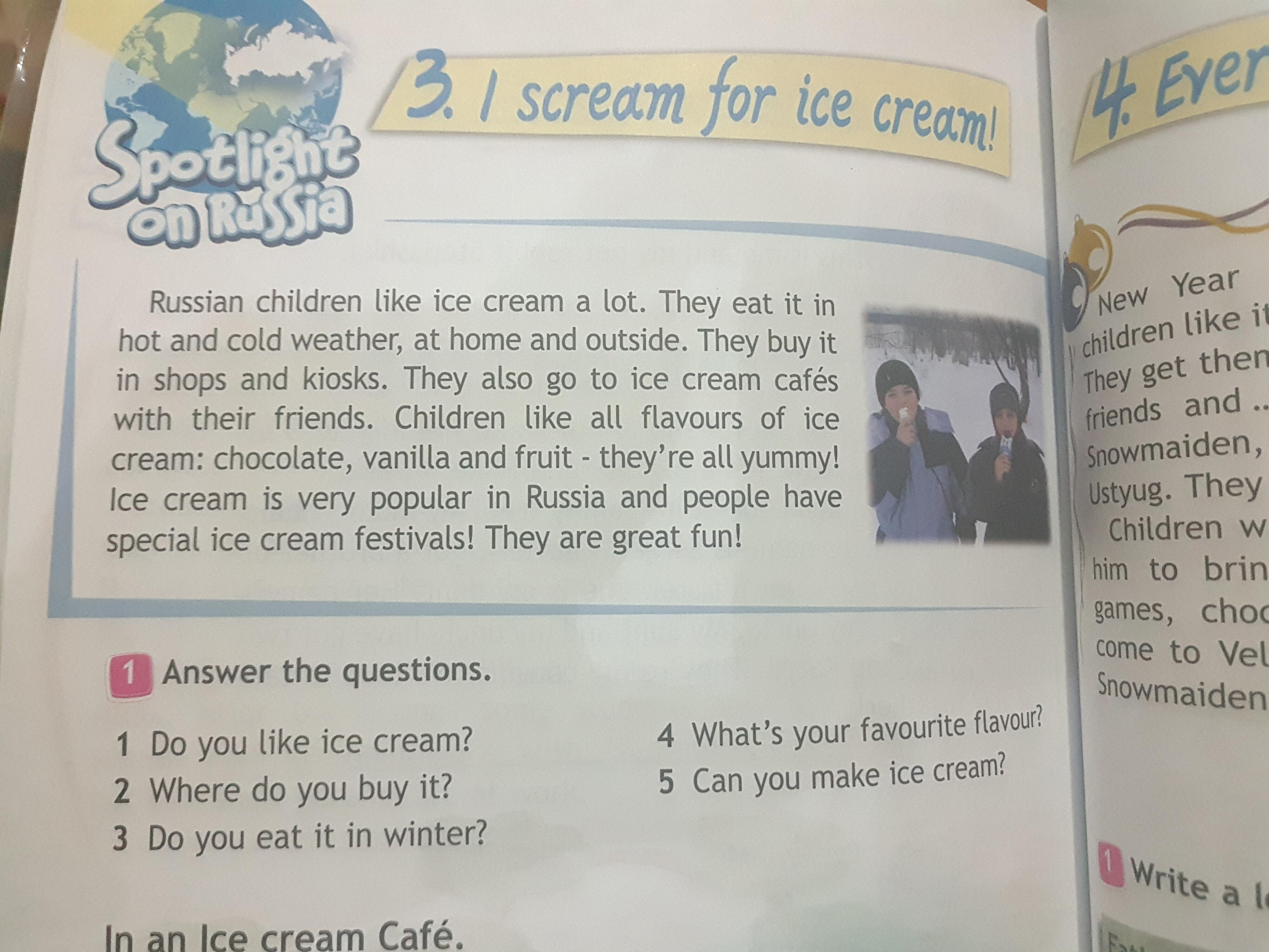 Русские дети очень любят мороженое. Они едят его в жаркую и холодную погоду, дома и на улице ( или точнее вне дома). Они покупают его в магазинах и киосках. Они ходят за мороженным в кафе с их друзьями.Дети очень любят вкус мороженого : шоколад, ваниль и фрукты -