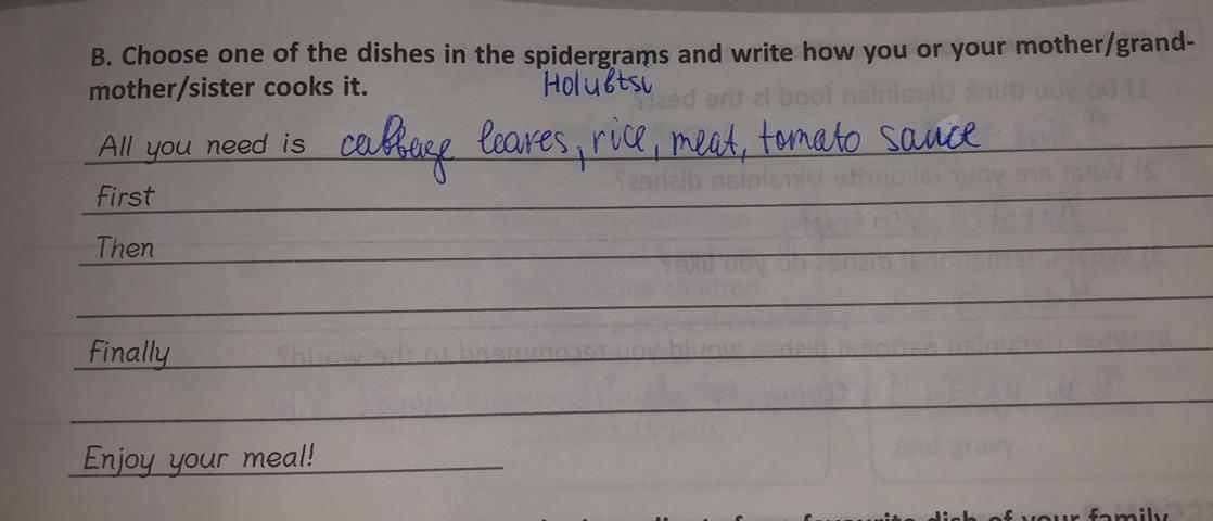 Then she grind meat , add rice , tomato sous, oil , greens , salt and papper.