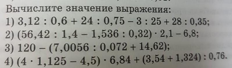 Ответ:1)3,12:0,6+24:0,75-3:25+28:0.35=5,2+32-0,12+80=117,08