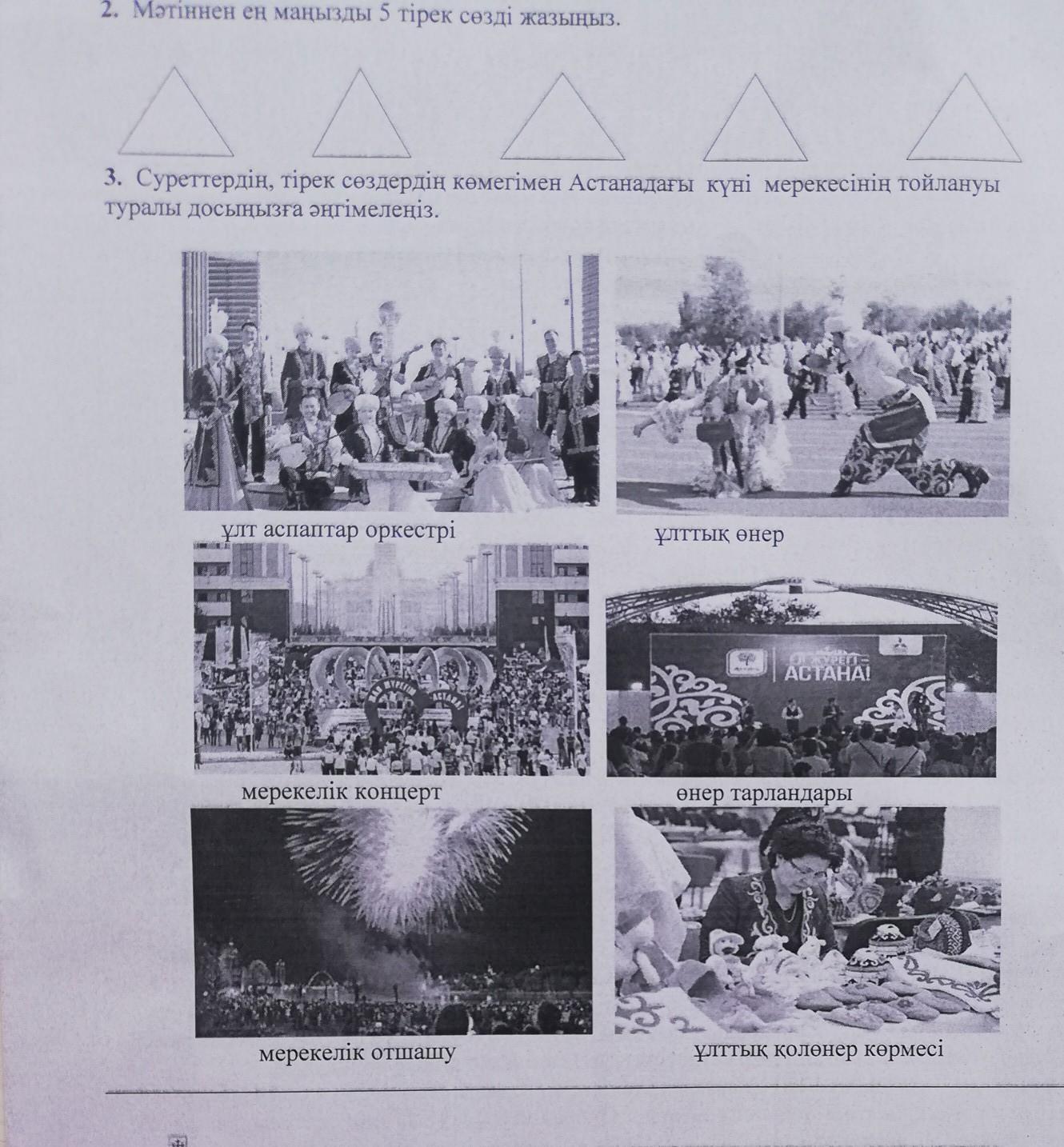 Мен кеше Астана күнінің тойлану мерекесінде болдым. Онда ұлт аспаптар оркестрі ойнады. Қазақша күрес, арқан тарту, тағы басқа ұлттық өнерлер көрсетілді. Мерекелік концертте елге танымал өнер тарландары болды. Ұлттық қолөнер көрмесі қатты ұнады.
