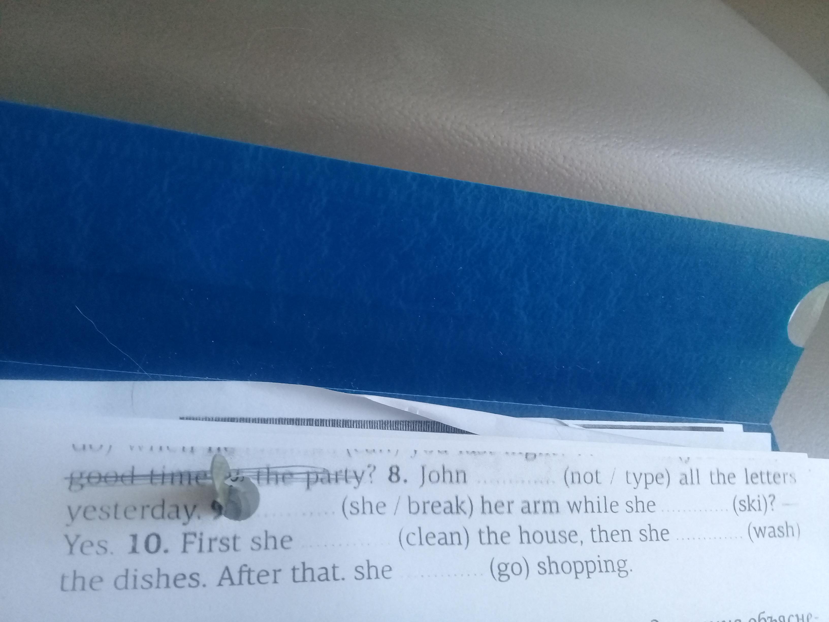 1. Jill wrote a long letter yesterday. 2. Mark was cooking dinner when the phone rang. 3. Paul did not go out yesterday. 4. He was eating breakfast when he heard a knock on the window. 5. The children were playing in the park when it started to rain. 6. - этого пункта нет на фотографии. 7 - этого пункта нет на фотографии. 8. John did not type all the letter yesterday. did she break her arm while she was skiing ? - Yes. 10. First she cleant the house, then she washed dishes. After that she went shopping.