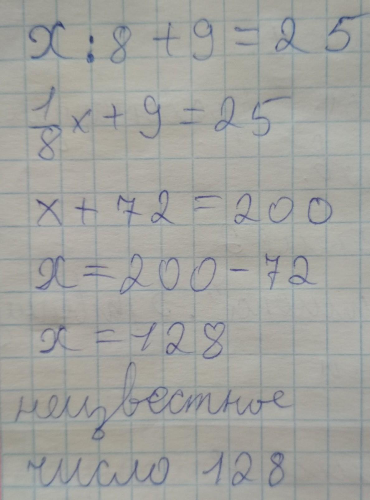задумано число если его разделить на 8 и результату прибавить 9 получено 25 какое число задумано