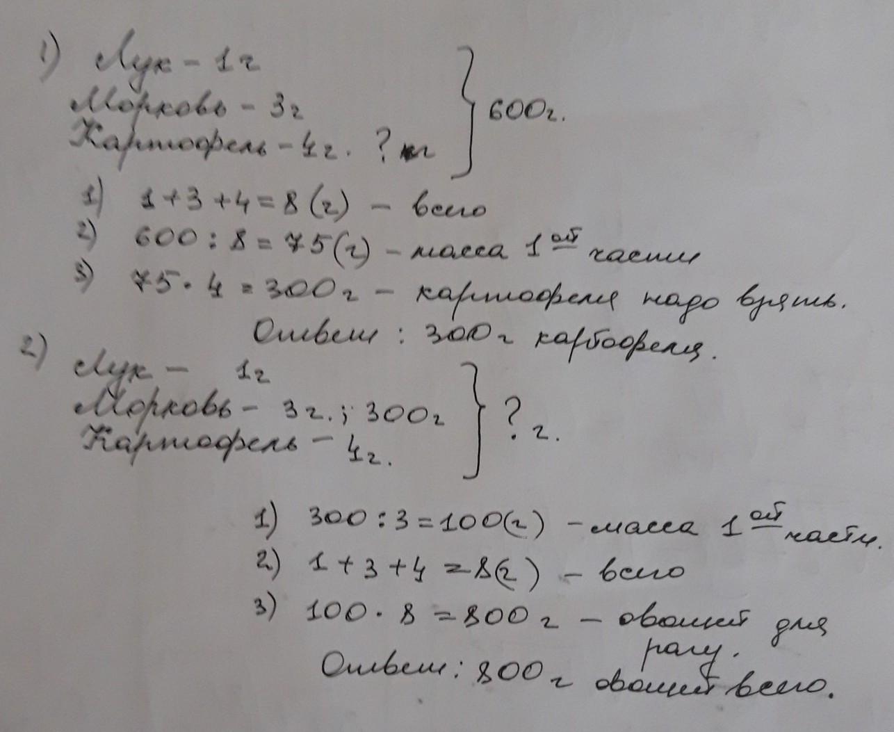 Задача 5класс . Для овощного рагу нужно 3 части моркови, 1 часть лука и 4 части картофеля 1) сколько картофеля надо взять, чтобы подготовить для рагу 600 г овощей? 2) Сколько всего овощей потребуется для рагу, если взять 300 г морковки? помогите пожалуйста