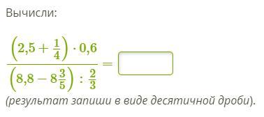 После этого выражения = (2,5+0,25)×0,6/(8,8-8,6):2/3 = 2,75×0,6/0,2:2/3= 1,65/0,2×3:2=1,65:0,3=5,5