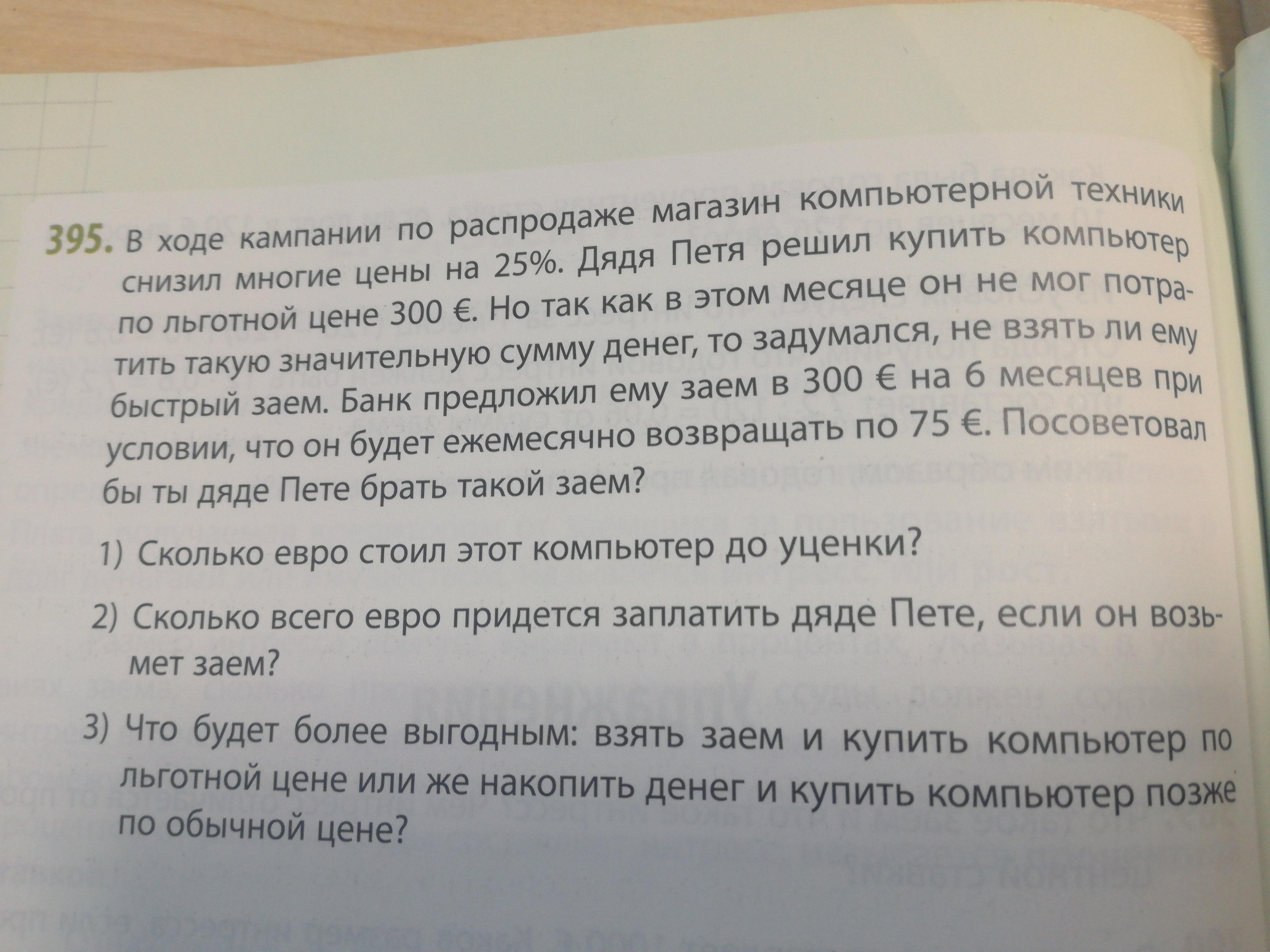 1) До уценки компьютер стоил 300 евро + 25%. 25% от 300 = 75 (300:100х25). Следовательно 300 евро + 75 евро = 375 евро.