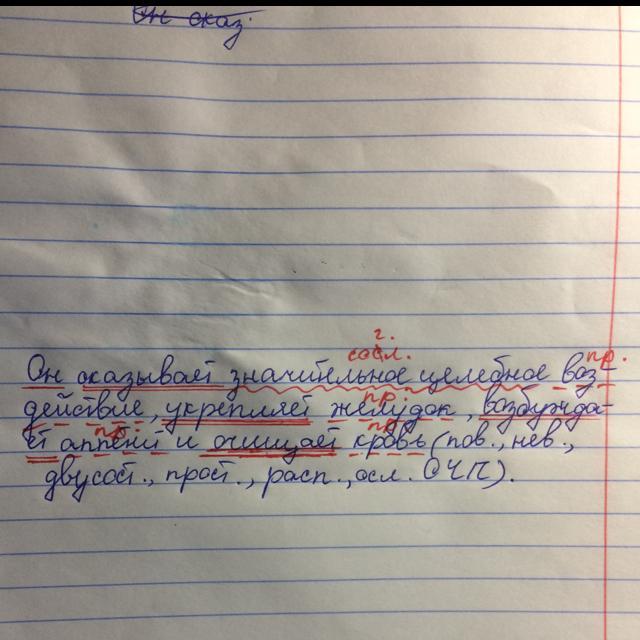 Синтаксический разбор предложения с его характеристикой(он оказывает значительное целебное воздействие, укрепляет желудок ,возбуждает аппетит и очищает кровь)