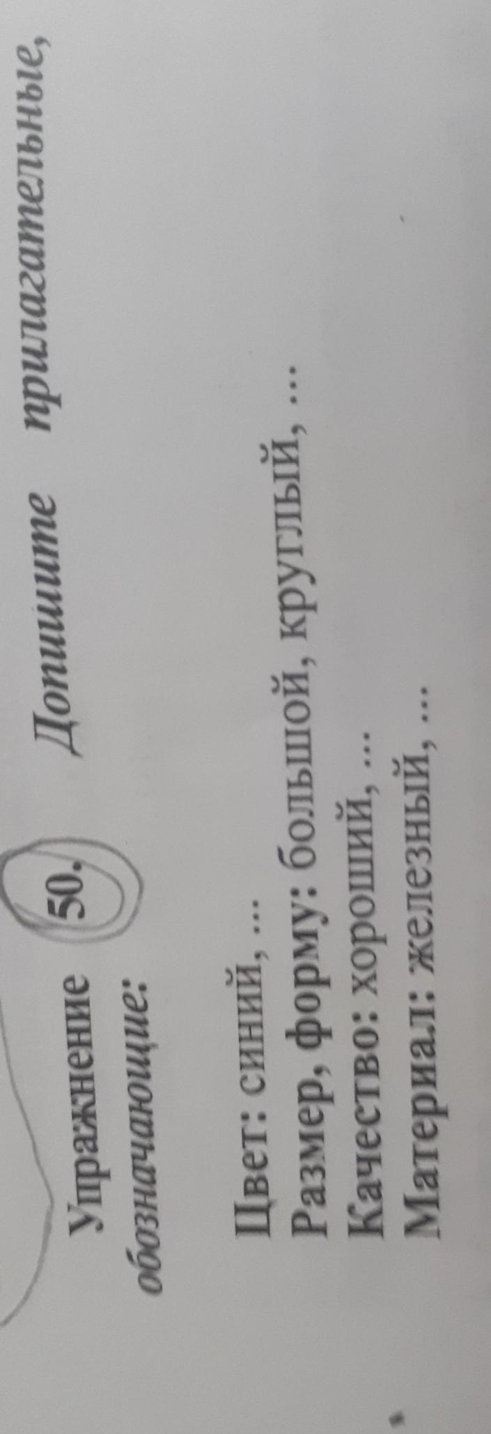 дописать прилагательные обозначающие:цвет,размер или форму,качество,материал.
