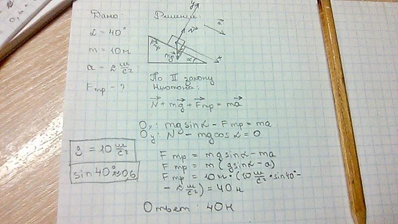 Задача по физике.Надо с рисунком и уравнениями на оси X Y. С наклонной плоскости, имеющей угол наклона 40°, соскальзывает тело массой 10 кг. Определите силу трения,если ускорение тела равна 2 м/с^2