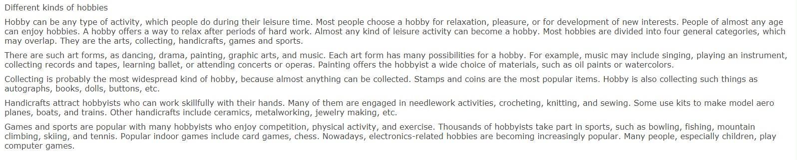 Kind -- type; free time -- leisure time; to suggest -- to offer (в тексте offers); difficult -- hard; much -- most; to contain -- to include (в тексте include); to visit -- to attend (в тексте attending); perhaps -- probably; an item -- a thing (в тексте things); a ship -- a boat (в тексте boats); mental -- skillfully; to be fond of -- enjoy; the base -- a kit (в тексте kits); several -- some; old -- a hobbyist (в тексте hobbyists); to focus -- to be engaged in (в тексте engaged in); great -- skillfully; various -- wide; nice -- skillfully; a lot of -- many.