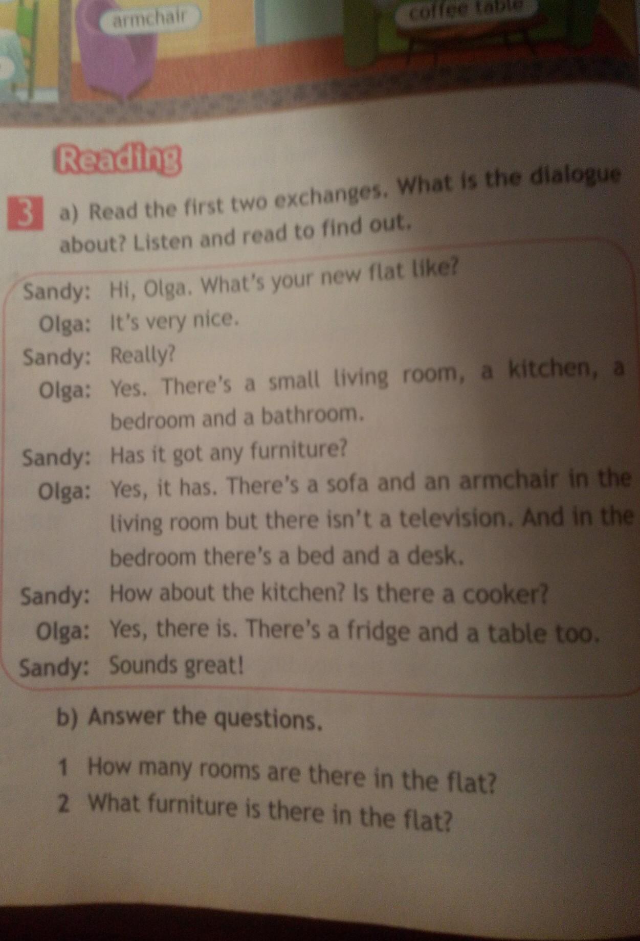 В первом вопросе написано 1) Сколько комнат в квартире? если у тебя 2 комнаты напиши так I have 2 rooms in the apartment. а если у тебя три комнаты пиши также но замени 2 на 3 .А во 2 вопросе написано .Какая мебель есть в квартире? ответить на него нужно так .In my apartment there is a sofa, chair, kitchen cabinets, wardrobe, a few shelves, mirror, several Cravath desk, chair, computer (laptop), etc. :-)