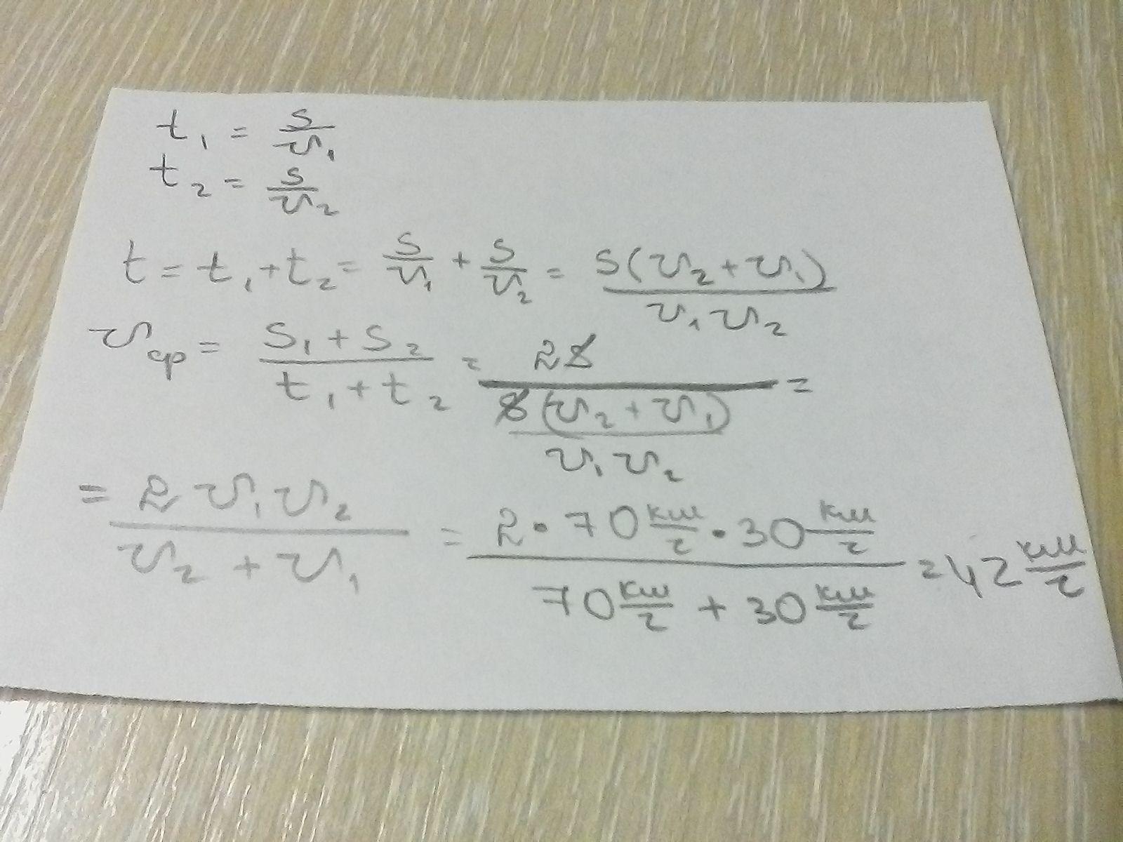 чему равна средняя скорость движения автомобиля на всем пути, если первую половину пути он двигался со скоростью 70 км\ч, а вторую половину пути-со скоростью 30 км\ч?