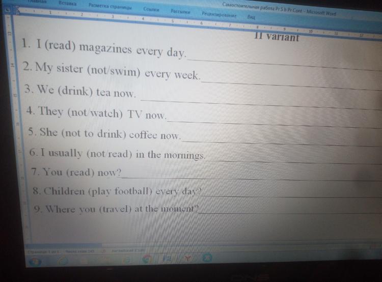 1)read 2) doesn't swim 3)are drinking4) aren't watching 5) isn't drinking 6) don't read 7) Are you reading now? 8) Do children play football every day ?9)Where are you travelling at the moment?