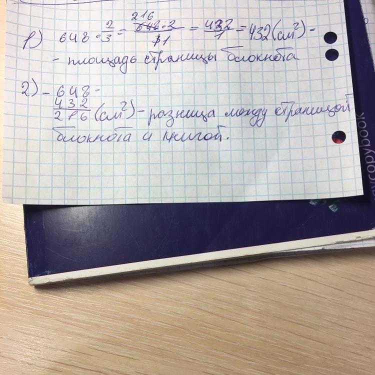 Реши задачу.Площадь книги 648 см2.Площадь страницы блокнота составляет 2/3 части площади страницы книги. На сколько квадратных сантиметров страницы блокнота меньше площади страницы книги?