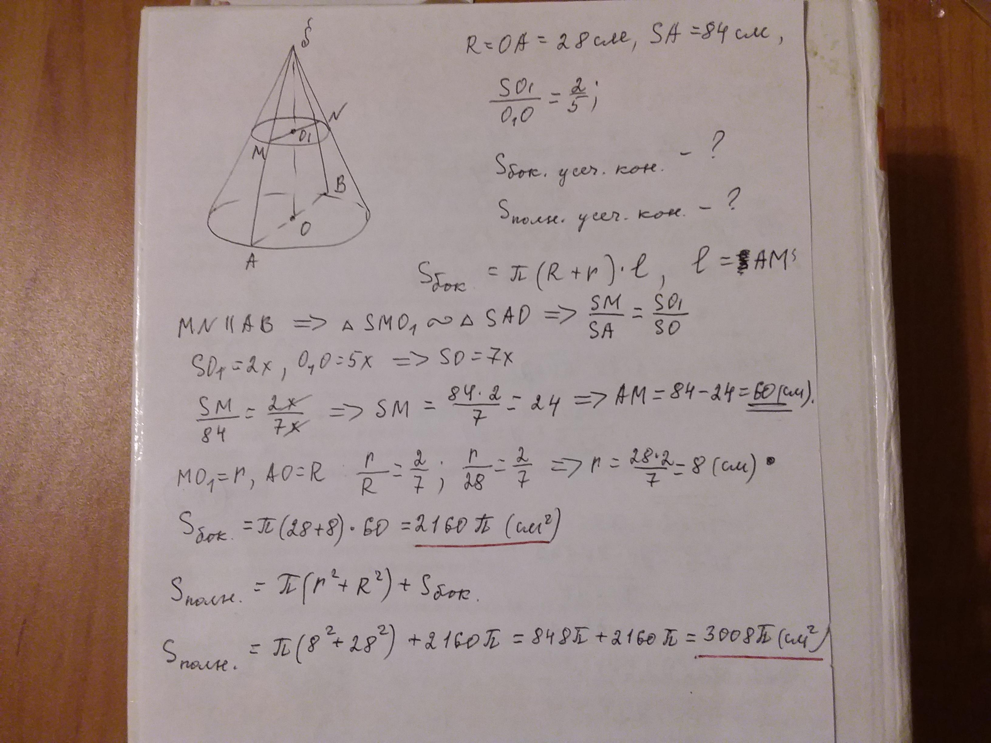 Секущая плоскость делит высоту конуса, радиус основания которого 28см, а образующая 84см, в отношении 2:5, считая от вершины. Найдите боковую и полную поверхность усеченного конуса