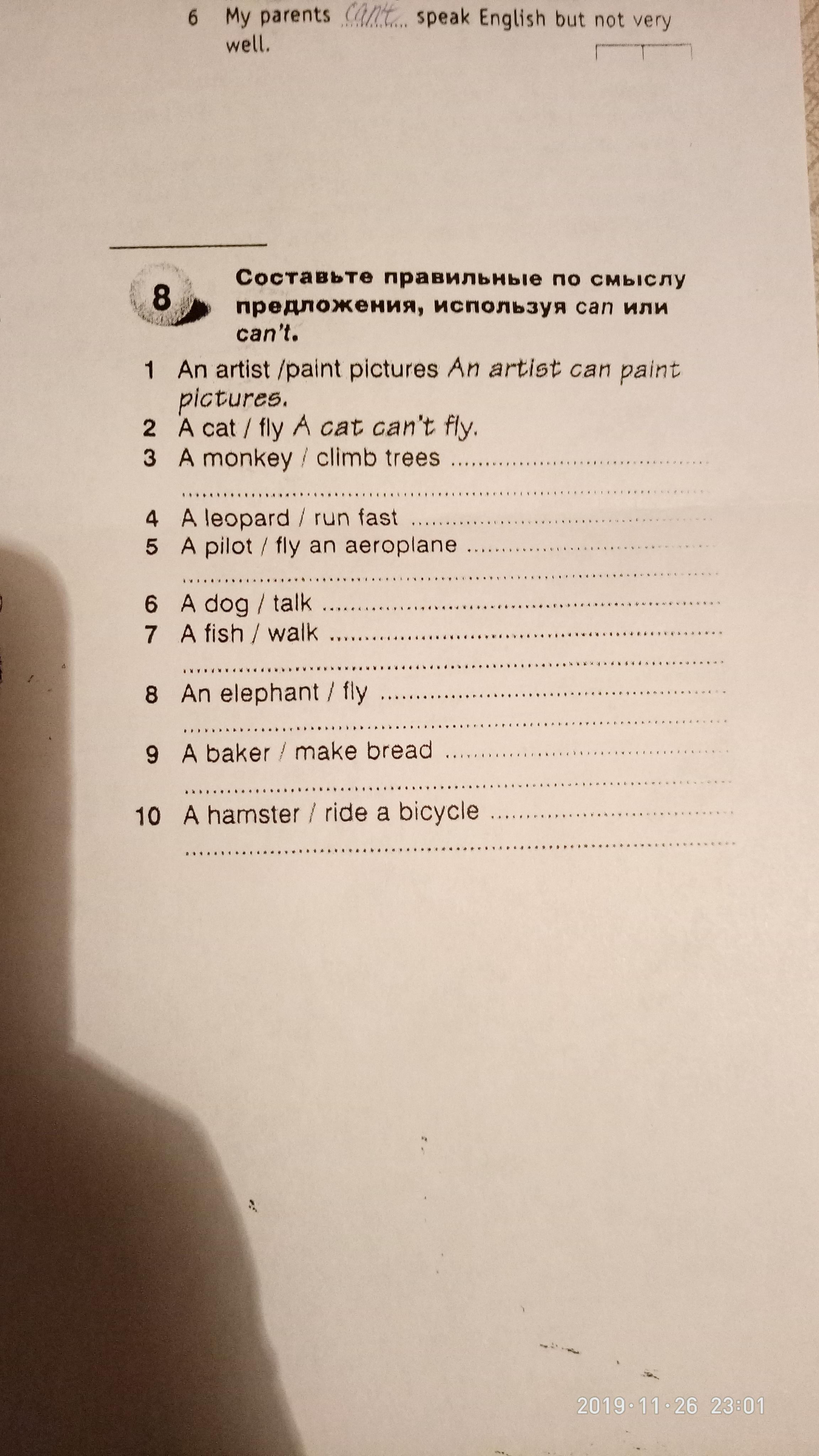 a monkey can clean trees. a leopard can run fast.a pilot can fly an airplane.a dog can't talk. a fish can't walk. an elephant can't fly.a baker can make bread.a hamster can't right a bicycle
