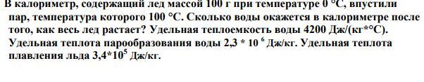 тогда 0.034= m*(2.3+0.42), m=0.034/2.72= 0.0125 кг пара (воды) впустили, значит всего воды станет М=0.1+0.0125= 0.1125 кг -ответ