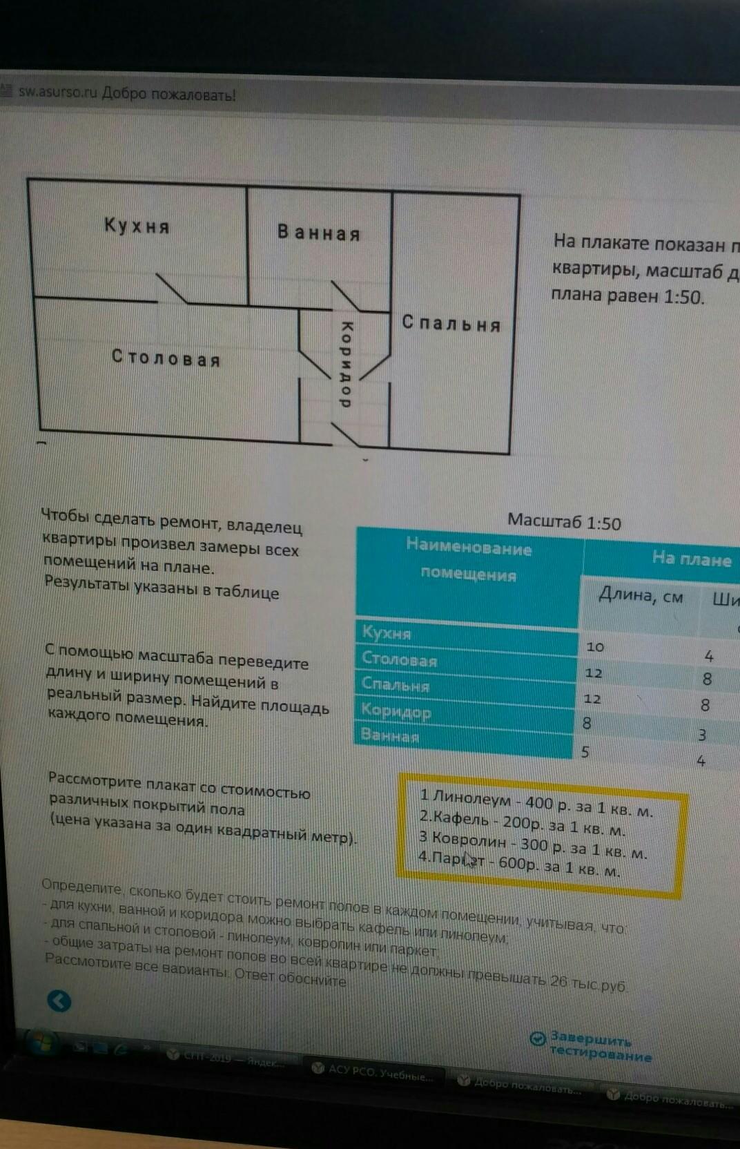 Учитывая , что стоимость затрат на все полы не должна превысит 26 000 руб., паркет не подходит . Остается ковролин , линолеум и кафель.