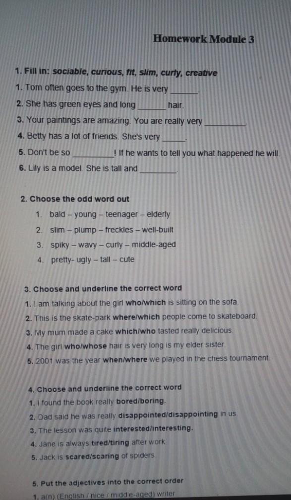 3. a (famous Greek/well-built) boxer 4, a( tall / French / sociable) actor