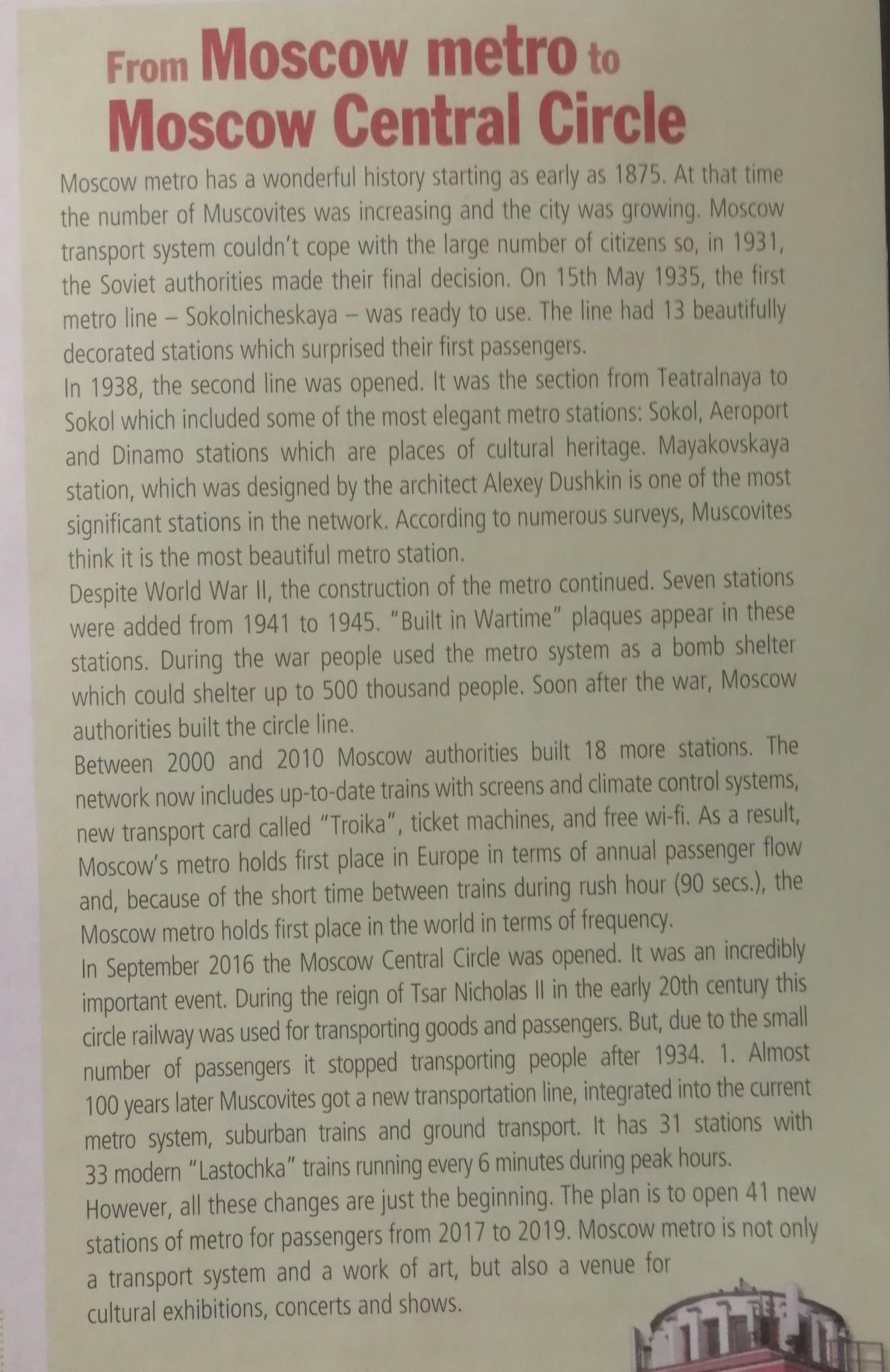У московского метро прекрасная история, начиная с 1875 года. В то время число москвичей росло, а город рос. Московская транспортная система не справлялась с большим количеством граждан, поэтому в 1931 году советские власти приняли окончательное решение. 15 мая 1935 года первая линия метро - Сокольническая - была готова к эксплуатации. На линии было 13 красиво оформленных станций, которые удивили своих первых пассажиров. В 1938 году была открыта вторая линия. Это был отрезок от Театральной до Сокола, в который входили некоторые из самых элегантных станций метро: Сокол, Аэропорт и Динамо, являющиеся местами культурного наследия. Станция Маяковская, которую спроектировал архитектор Алексей Душкин, является одной из самых значимых станций в сети. Согласно многочисленным опросам, москвичи считают, что это самая красивая станция метро. Несмотря на Вторую мировую войну, строительство метро продолжалось. Семь станций были добавлены с 1941 по 1945 год. На этих станциях появляются таблички «Встроенные в военное время». Во время войны люди использовали систему метро в качестве бомбоубежища, которое могло укрыть до 500 тысяч человек. Вскоре после войны московские власти построили круговую линию. Между 2000 и 2010 годами московские власти построили еще 18 станций. Сеть теперь включает в себя современные поезда с экранами и системами климат-контроля, новую транспортную карту под названием «Тройка», билетные автоматы и бесплатный Wi-Fi. В результате московское метро занимает первое место в Европе по годовому пассажиропотоку, а из-за короткого времени между поездами в час пик (90 секунд) московское метро занимает первое место в мире по частоте В сентябре 2016 года Московский Центральный Круг был открыт. Это было невероятно важное событие. Во времена правления царя Николая I в начале 20 века эта кольцевая железная дорога использовалась для перевозки грузов и пассажиров. Но из-за небольшого количества пассажиров он прекратил перевозку людей после 1934 года. 1. Почти 100 лет спустя москвичи получили новую транспортную линию, интегрированную в действующую систему метро, пригородные поезда и наземный транспорт. Он имеет 31 станцию с 33 современными поездами «Ласточка», которые ходят каждые 6 минут в часы пик. Однако все эти изменения - только начало. В планах открытие 41 новой станции метро для пассажиров с 2017 по 2019 год. Московский метрополитен - это не только транспортная система, но и работы по искусству, культурные выставки, концерты.