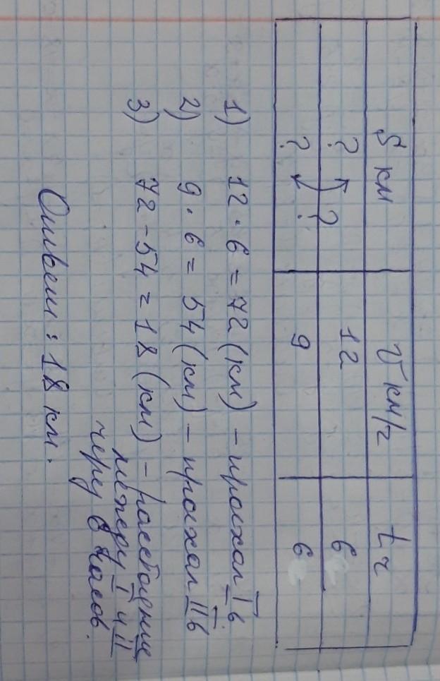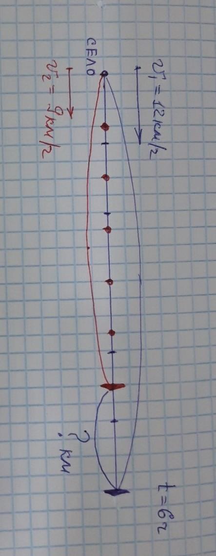 НАДО НАЧЕРТИТЬ ОТРЕЗОК из одного села в одном направлении одновременно выехали два велосипедиста один из них ехал со скоростью 12км/ч , а второй 9км/ч какое расстояние будем между ними через 6 часов после начала движения