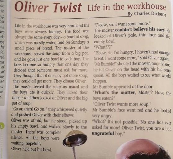 Жизнь Оливера Твиста на рабочем месте у Чарльза Диккенса в ее жизни была очень тяжелой, и «Пожалуйста, сэр. Я хочу еще». мальчики всегда были голодны. Еда была, хозяин не мог поверить своим ушам. Хрк анг посмотрел на бледное худое лицо Оливера и пустую миску. "Какая???" «Пожалуйста, сэр, я голоден. У меня не было еды. Я хочу еще», - снова сказал Оливер. - Мистер Бамбл! - сердито закричал мастер и ударил Оливера по голове своим большим звуком. - всегда один и тот же каждый день - тарелка супа, который был в основном водой, а по воскресеньям - маленький кусочек хлеба. Мастер дома Ид подал суп из большой кастрюли, и он дал по одной чашке каждому мальчику. Мальчики из Аут стали настолько голодными, что однажды решили, что кто-то должен попросить больше. Они думали, что если один мальчик получит больше супа, ложку. Все мальчики ждали, что бы они могли получить больше. Они выбрали Оливера. бывает. Мистер Бамбл появился у двери. Мастер подал суп, как обычно, и мальчики быстро его съели. Они облизали их: «В чем дело, Учитель? Пальцы, а потом посмотрели на Оливера и больших мальчиков съели?» горшок супа. "Продолжай! Продолжай!" - тихо прошептали они, - лицо мистера Бамбла побагровело, и он посмотрел и толкнул Оливера локтями. Оливер испугался, но встал, поднял: «Что? Это невозможно! Ни у кого нет даже пустой чаши, и он медленно пошел к просящему больше». Оливер Твист, вы бэк-мастер. Наступила полная тишина. Все мальчики ждали, надеюсь, Оливер протянул свою миску. Он: «Оливер Твист хочет еще супа!», Очень злой, благодарный мальчик ».
